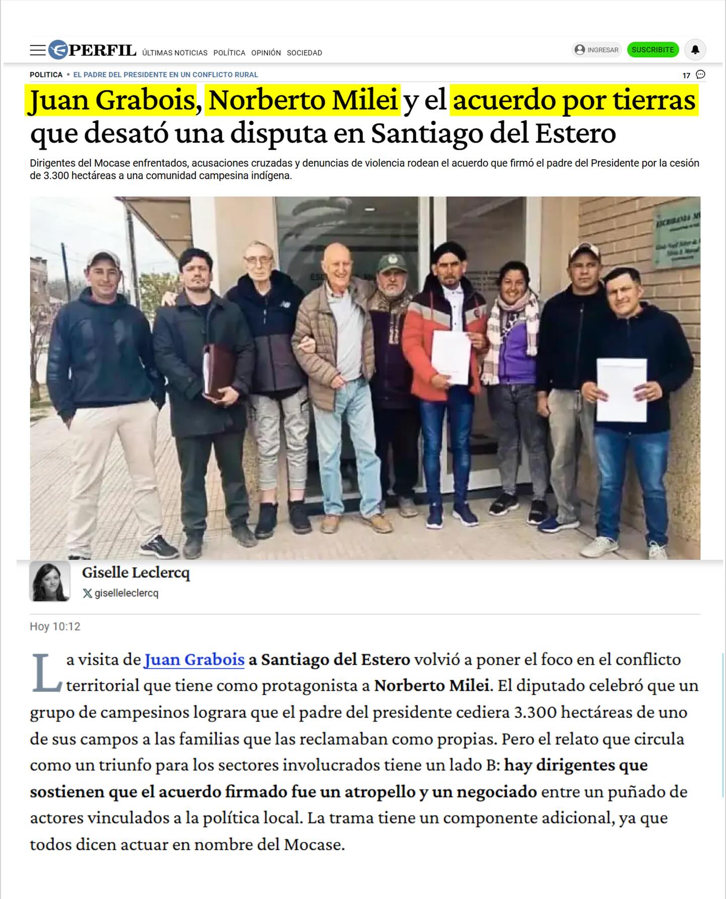 La visita de Juan Grabois a Santiago del Estero volvió a poner el foco en el conflicto territorial que tiene como protagonista a Norberto Milei. El diputado celebró que un grupo de campesinos lograra que el padre del presidente cediera 3.300 hectáreas de uno de sus campos a las familias que las reclamaban como propias. Pero el relato que circula como un triunfo para los sectores involucrados tiene un lado B: hay dirigentes que sostienen que el acuerdo firmado fue un atropello y un negociado entre un puñado de actores vinculados a la política local. La trama tiene un componente adicional, ya que todos dicen actuar en nombre del Mocase.